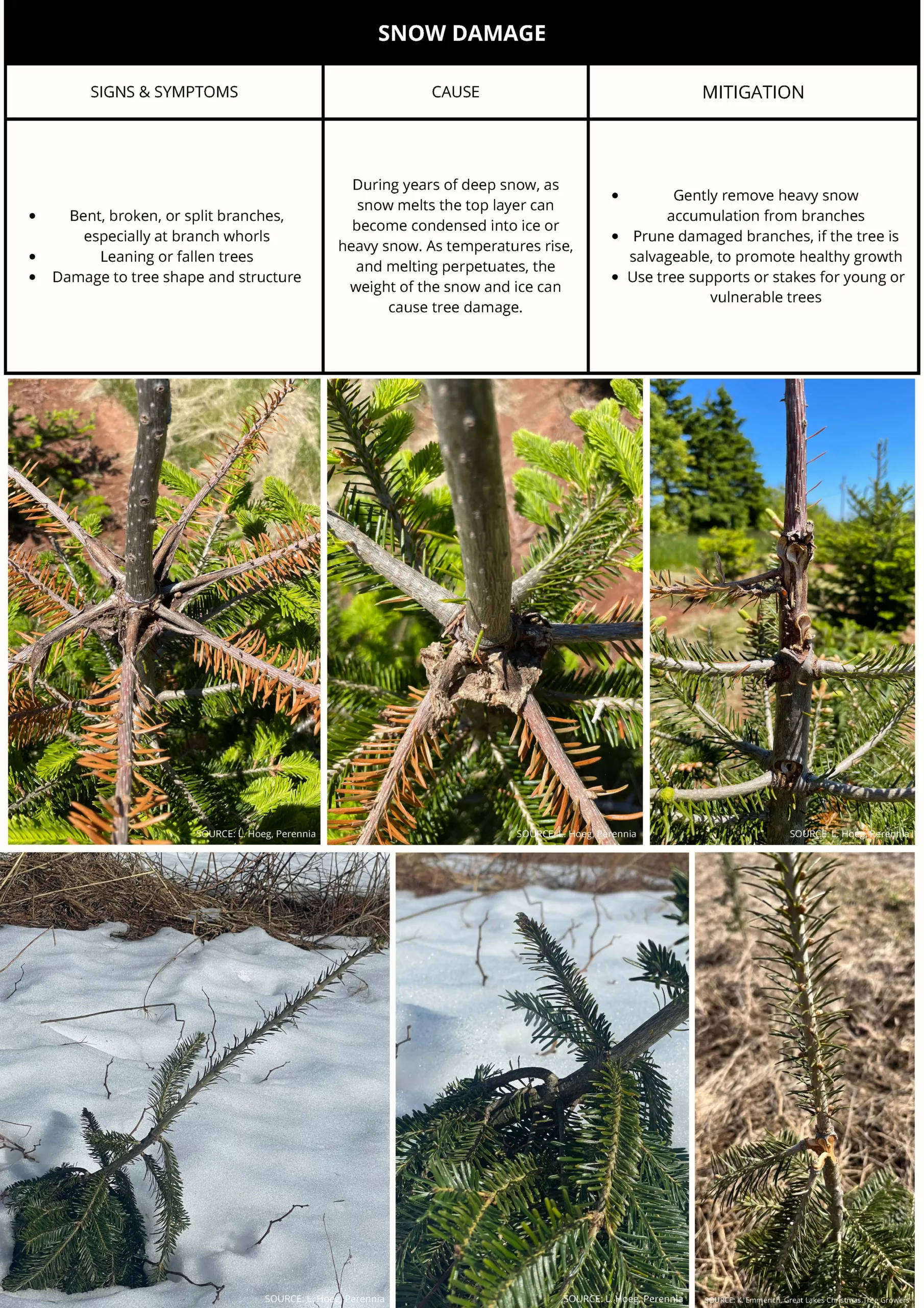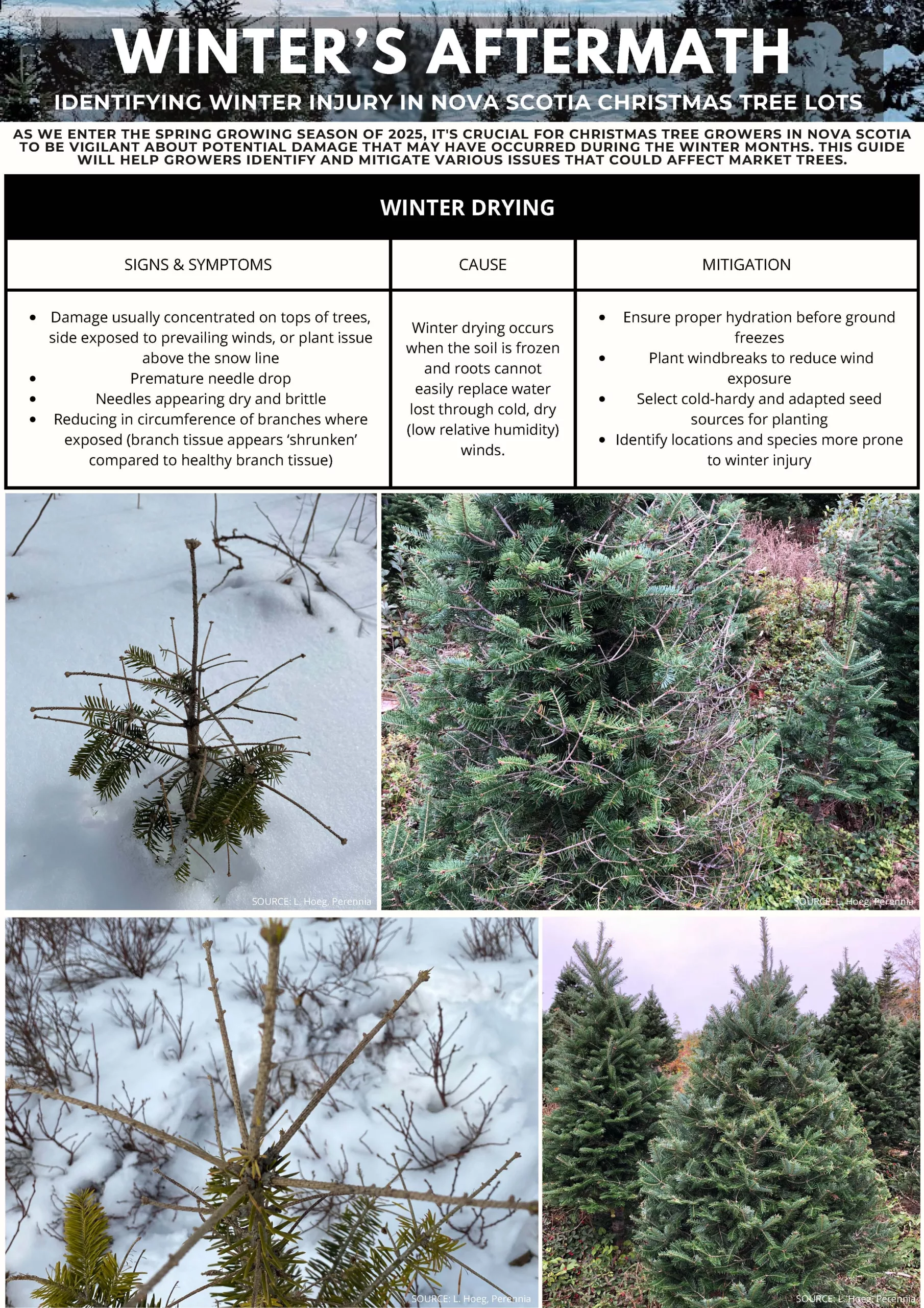 Winter poses several challenges for Christmas tree growers in Nova Scotia. Understanding the different types of winter injury is key to protecting your trees and maintaining a healthy crop. This detailed resource explores common winter damages, including winter drying, winter burn, snow damage, frost heave, and animal damage. Each section offers insights supported by photos to help you identify and manage these issues effectively.